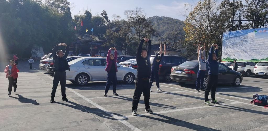 徒步路线自江南校区图书馆起,沿南环路向西,途径香溪路,沿香溪洞景区步行栈道上行,至香溪洞景区广场,在广场集体演练太极拳、五禽戏、八段锦、广场舞等健身项目后,徒步香溪洞景区,出景区后原路返回学校。途中绿水青山,暖阳和煦,pp电子教工精神饱满,欢声笑语不断。