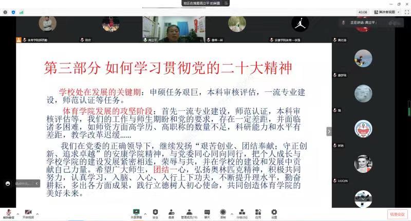 本次工会活动运用“腾讯会议”软件以线上形式开展,邀请pp电子党总支书记高立平同志为pp电子全体教师作了题为《深入学习党的二十大精神—奋斗新征程》的主题报告,从党的二十大召开概况;党的二十大的主要精神和如何贯彻党的二十大精神等三个方面进行了宣讲。