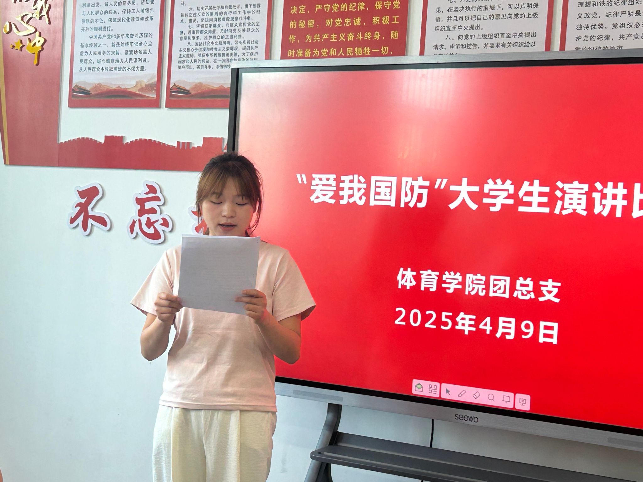 选手们或激昂陈词呼吁居安思危,或娓娓道来分享红色故事,通过鲜活案例、深情告白,生动诠释了“天下虽安,忘战必危” 的深刻内涵。“当我在训练场摸爬滚打时,迷彩服上的汗水就是青春献给国防的勋章!”体育教育专业2023级退伍学生闫硕以亲身经历讲述《迷彩青春里的强军梦》,用朴实话语还原军营淬炼历程,引发全场共鸣;2022级邢东妮以《青春不止诗与远方,还有铁与火的担当》为题,结合专业特色提出将体育精神与国防责任有机结合,展现新时代体院学子的独特视角。