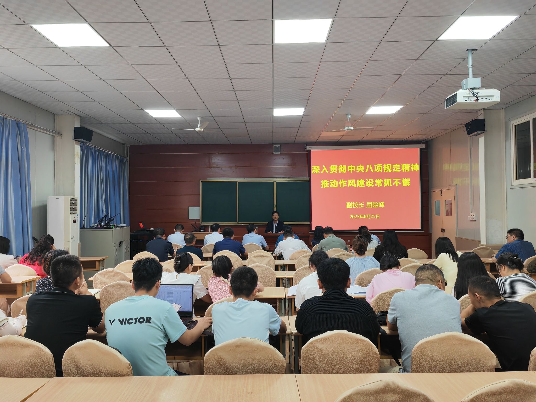 为持续巩固拓展主题教育成果,深入推进全面从严治党,切实强化党员干部作风建设,6月25日下午,副校长屈险峰以《深入贯彻中央八项规定精神,推动作风建设常抓不懈》为题,为pp电子、数统学院、学工部、保卫部、工会、团委、后勤处和信管中心全体党员干部讲授专题党课。