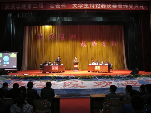 pp电子第二届“金雀杯”辩论赛决赛于2010年11月22日晚7:30在西校区大礼堂举行,学院党委副书记胡鸿晓教授、各院系党总支书记和各系团总支书记参加。