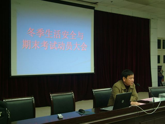 2010年11月26日下午5:30,体育系在图书馆六楼报告厅组织召开了冬季生活安全教育和期末考试动员大会,系学生工作领导小组全体成员和体育系全体学生参加了大会。大会由体育系副主任鲁宗成主持。