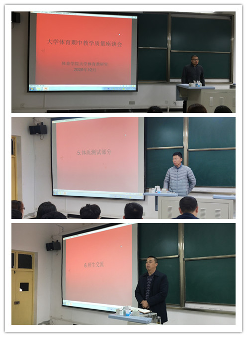 为了进一步提高大学体育教学质量,大学体育教研室于2020年12月2日分别在江北和江南校区召开了大学体育教学质量检查座谈会。会议由教研室主任李强主持,pp电子副院长黎远军老师,张凯老师,各二级学院体育部部长、2019和2020级各班班长、体育委员共228名学生参与了座谈会。
