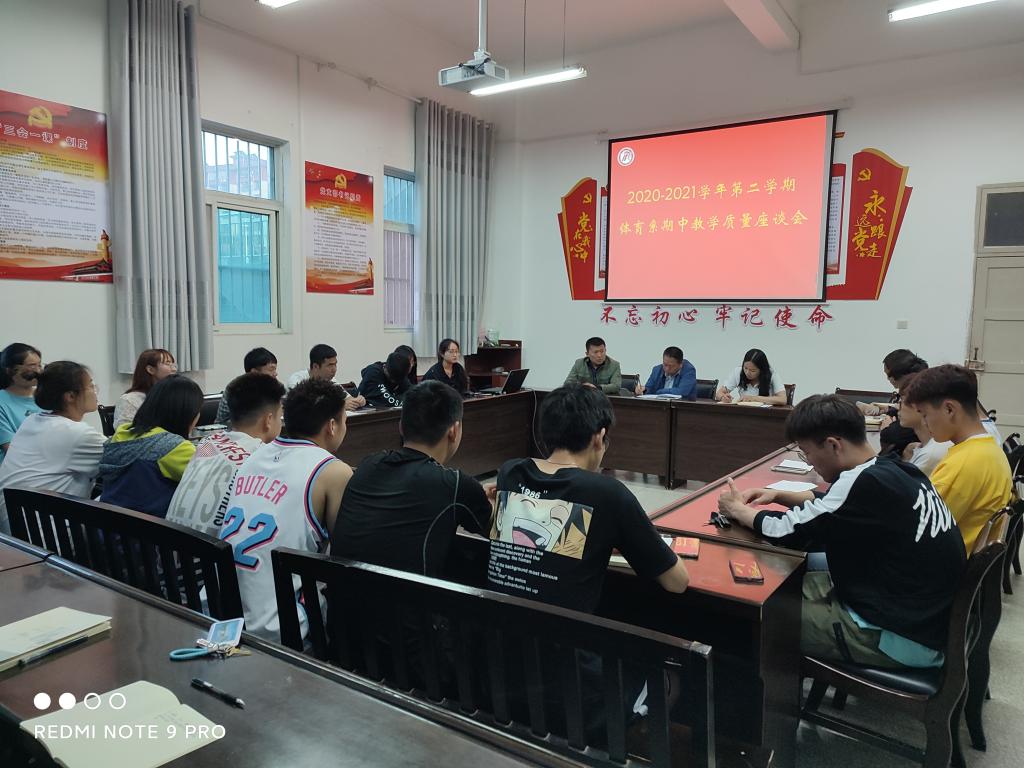 2021年4月29日,pp电子体育系在体育馆一楼会议室召开期中教学质量座谈会。pp电子党总支书记高立平、pp电子副院长郭西魁、pp电子各班班长、团支书、学习委员、学生代表参加了此次会议,会议由体育系主任李靖主持。
