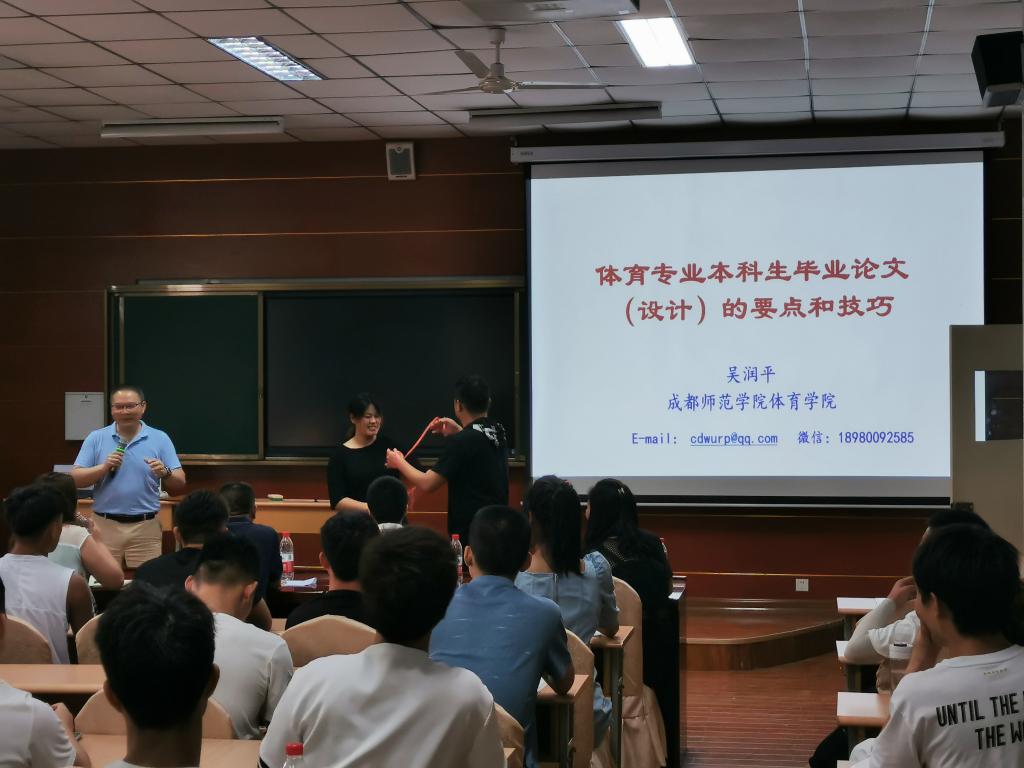 为提高pp电子官网学生毕业论文撰写技能,6月11日下午14:30,成都师范学院pp电子院长吴润平教授来pp电子官网做了以“体育专业大学生毕业论文(设计)的要点和技巧”为主题的学术讲座,pp电子全体18级、19级学生参加了本次报告会,报告会由学院党总支书记高立平主持。