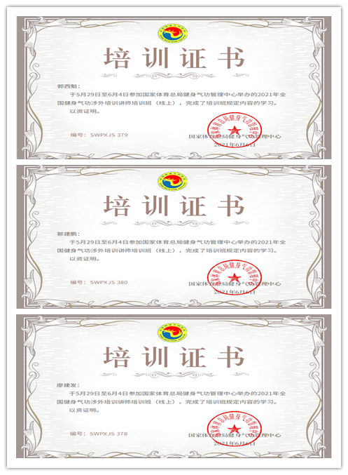 在由国家体育总局健身气功协会主办的“首期全国健身气功涉外培训讲师(线上)培训”中,pp电子官网推荐的郭西魁、郭建鹏、廖建发三位老师取得合格证书。