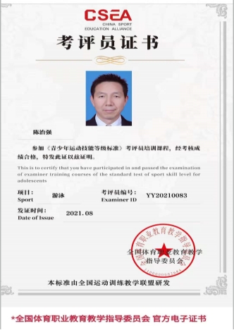 游泳是一项老少皆宜并深受人们喜爱的运动项目,它能够全面提高身体各系统的机能,改善体质水平,增进身心健康。同时,游泳也是一项重要的生存机能。为了促进安康游泳运动项目的发展,pp电子官网陈治强老师积极利用暑假时间,通过体教联盟平台进行线上学习,经过理论和实操两个环节的全面考核,获得了游泳项目考评员证书。游泳考评员资格的取得可以按照《青少年游泳运动技能等级标准》要求从事游泳项目考核相关工作,使考生能够在本地参与考核获取体教联盟认证的游泳项目等级证书,这对促进游泳项目的开展和学生学习的积极性具有重要意义。