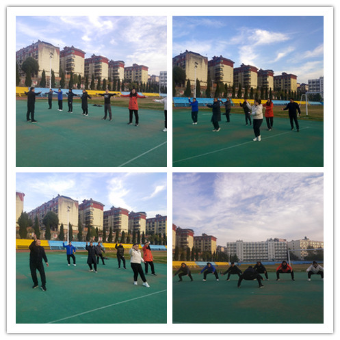 在太极拳动作技术教学环节,郭西魁老师主要分享了教学中学生易犯错误和纠正方法等方面的经验。随后,全体教师集体演练了24式太极拳。