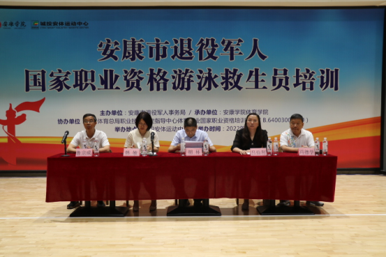 6月13日下午,安康市退役军人国家职业资格游泳救生员培训班开班仪式在城投安康运动中心一楼羽毛球馆举行,安康市退役军人事务局副局长胡林,pp电子院长吕仙利,项目负责人冯德学,国家职业资格游泳救生员培训师鲁宗成参加了开班仪式。