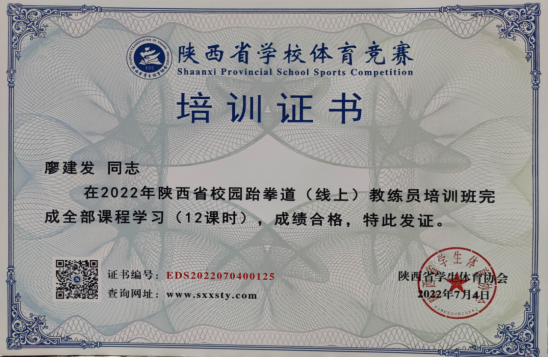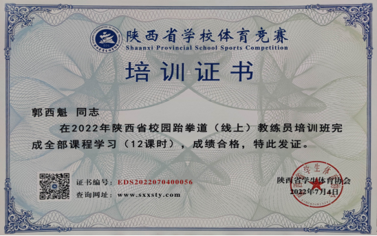 7月2日-3日,由陕西省学生体育协会主办,陕西省学生体育协会跆拳道运动专业委员会、西安文理学院承办的2022年陕西省校园跆拳道教练员、裁判员培训在西安文理学院举行。pp电子官网教师郭西魁、廖建发两位老师参加了此次培训。