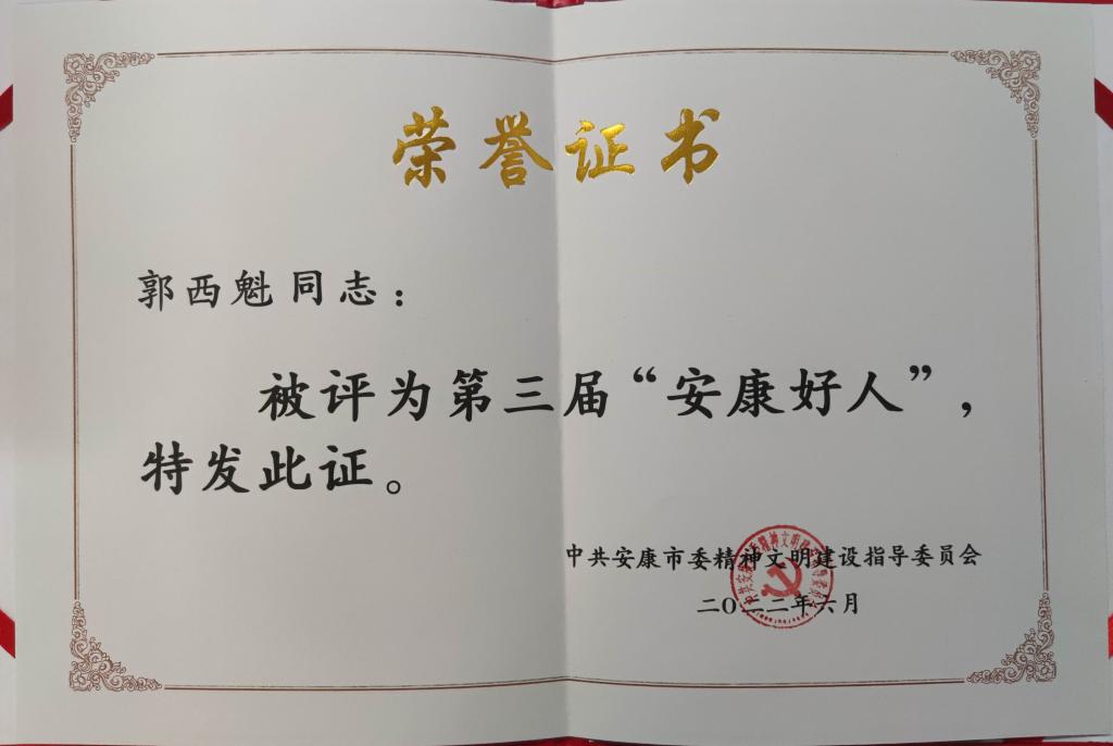 5月31日,中共安康市委精神文明建设指导委员会,授予全市62名(组)同志第五届安康市道德模范称号,授予77名同志第三届“安康好人”称号。pp电子官网副院长郭西魁同志被授予第三届“安康好人”称号。希望大家向安康市道德模范称号和“安康好人”称号获得者学习,积极参与安康市的精神文明建设,以优异业绩,向党的二十大献礼。