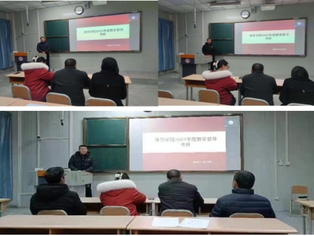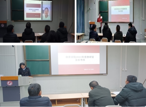 pp电子领导班子高度重视考核工作,成立了考核小组,制定了考核方案,在本次专题考核会上分三个批次进行考核。首先,对pp电子课程群负责人进行了考核,球类课程群负责人崔晓宇、操舞类课程群负责人陈治强、运动人体科学课程群负责人刘芹和学校体育学课程群负责人赵娇艳分别进行了年度总结汇报,考核组通过听取汇报、座谈和查阅工作记录的方式进行考核,并针对本年度工作中存在的不足对三位课程群负责人进行了现场反馈,并提出了下一步工作建议。