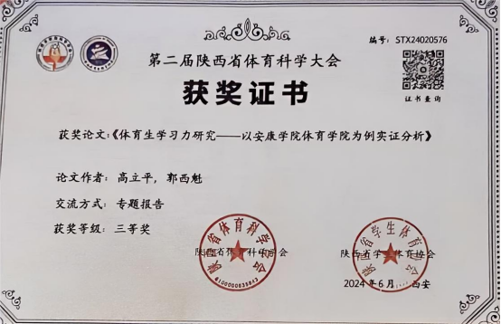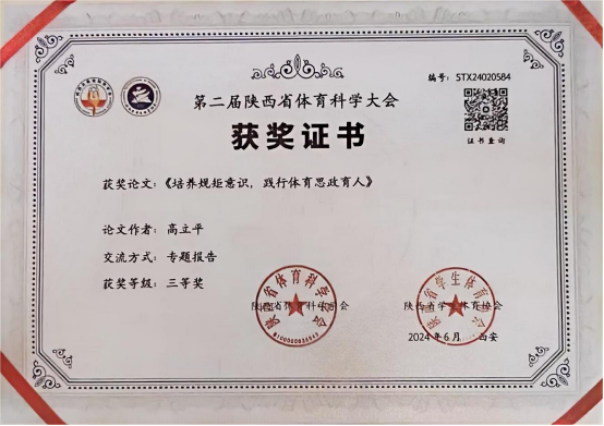 6月22日,第二届陕西省体育科学大会在陕西师范大学长安校区举行。pp电子官网教师高立平参加了本届论文报告会,并在论文报告会做了专题报告。高立平和郭西魁合作撰写的论文《体育生学习力研究—一以pp电子为例实证分析》和高立平撰写的论文《培养规矩意识,践行体育思政育人》均获得三等奖,并被第二届陕西体育科学大会正式录用。