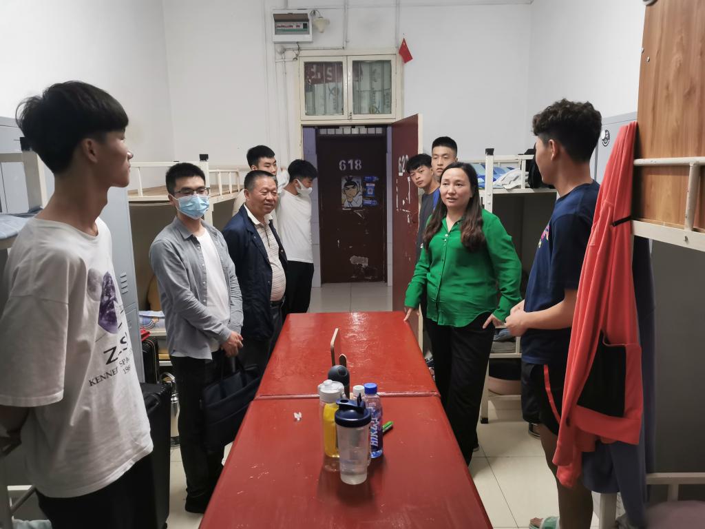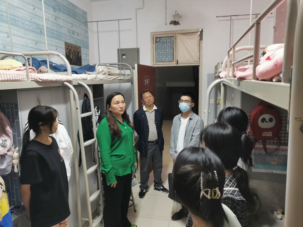 9月20日晚,pp电子官网党总支书记高立平、院长吕仙利、学工办副主任王立、团总支书记康梦瑶以及学生干部前往新生宿舍,走访看望2022级新入校学生。
