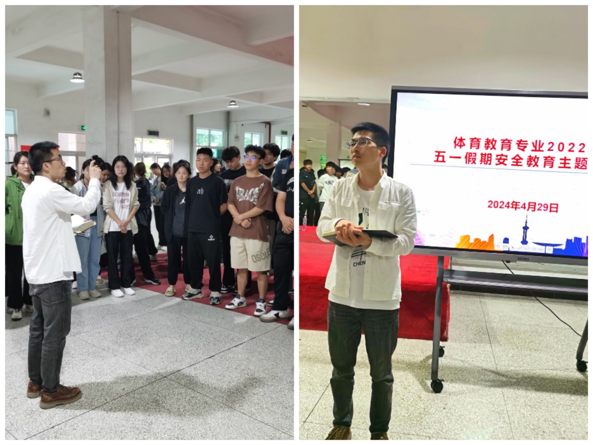 加强宣传教育,强化安全意识。4 月29日晚,pp电子官网在体育馆二楼召开全院学生安全教育大会,院长吕仙利向全体同学传达了学校关于“五一”放假的安排和具体要求;副院长郭西魁从国家安全、校园安全、生命安全等方面给同学们做了生动的教育。学院副院长李靖、团总支书记王毅、学工办主任王立、辅导员刘姚成也一起参加了安全教育大会。同时,“我是体育生”公众号上推出“五一出游安全”攻略,引导学生做好防范措施。