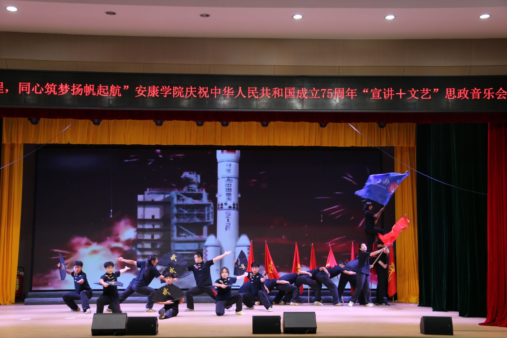 为庆祝中华人民共和国成立75周年,弘扬爱国主义精神,学校举办了“七十五载风雨兼程,同心筑梦扬帆起航”pp电子“宣讲+文艺”思政音乐会,pp电子官网选送的节目《武韵黄河》获二等奖。