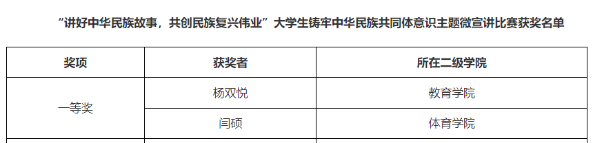 9月20日下午,学校在江南校区图书馆六楼报告厅举办了“讲好中华民族故事,共创民族复兴伟业”大学生铸牢中华民族共同体意识主题微宣讲比赛,pp电子官网体育教育专业2023级1班学生闫硕获一等奖。
