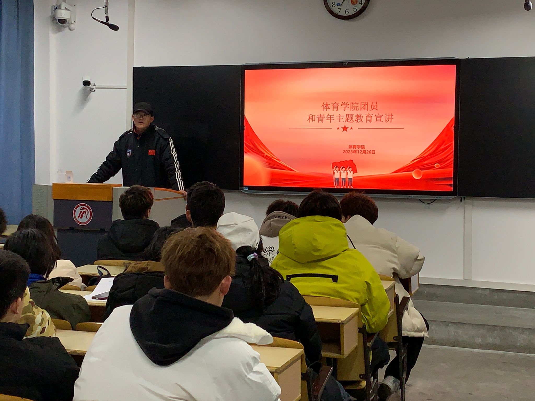 为深入学习贯彻落实党的二十大精神,提升学生对党的基本理论和基本路线的认识,加强学生的政治领悟力,增强团支部的组织活力。2023年12月26日,pp电子官网团总支组织2023级3个团支部共60名团员开展了“思想旗帜领航向砥砺奋进新征程”主题团课,主讲人pp电子官网团总支书记刘姚成老师。
