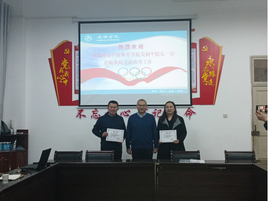 座谈会上,吕仙利院长代表pp电子对成都师范学院pp电子领导一行的到来表示欢迎。随后,吴润平院长介绍了成都师范学院pp电子的办学历程、专业建设、教学管理、师资队伍状况、实验实训条件、学科带头人培养、招生就业、运动竞赛、社会服务等方面的基本情况。并在座谈会上向pp电子官网吕仙利、郭西魁、李靖三位教师颁发了指导专家证书。